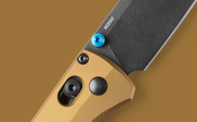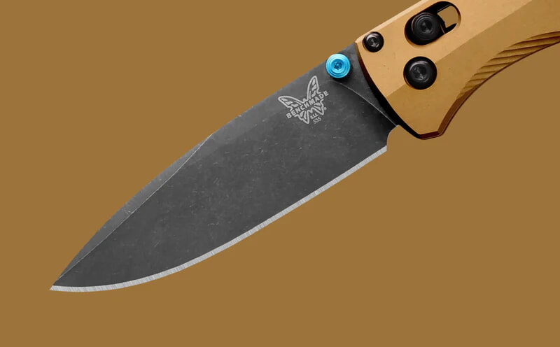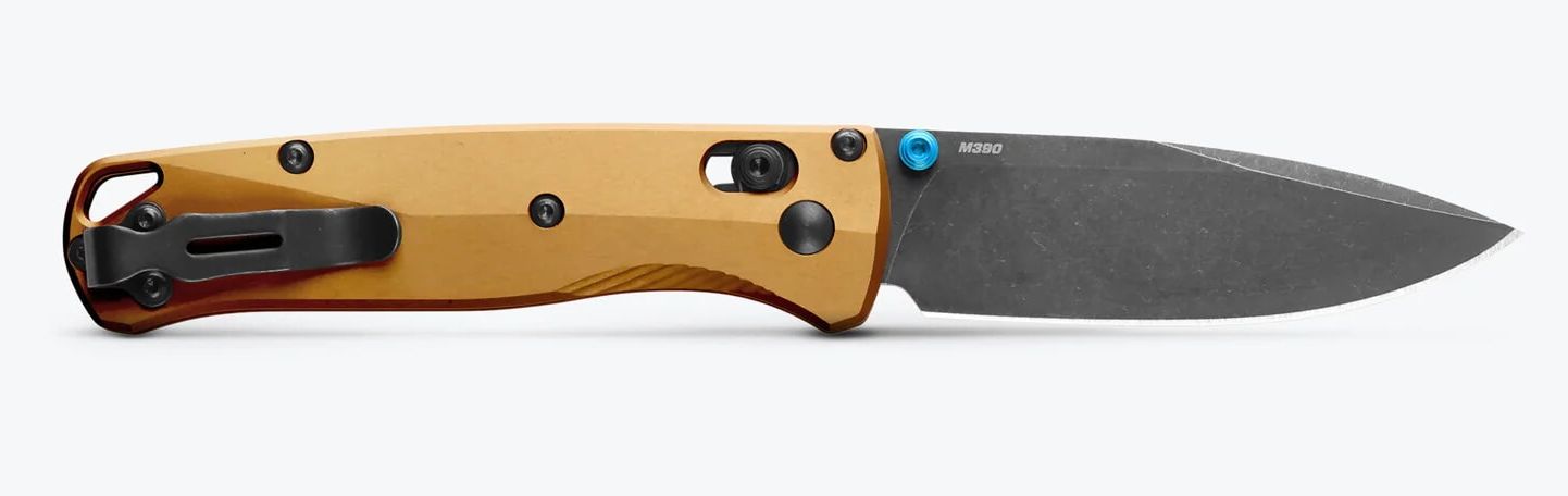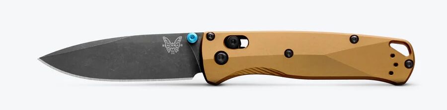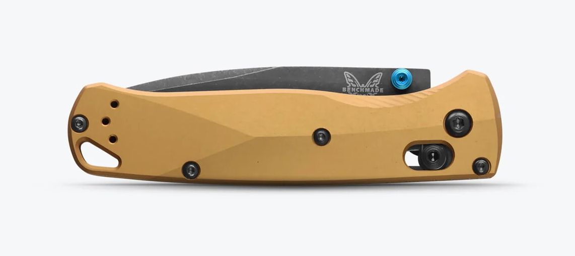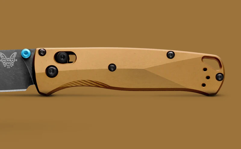 Benchmade 535BK-07 має витончений дизайн з акцентом на естетику та практичність. Руків'я виготовлене з анодованого алюмінію кольору "палаюча латунь", що забезпечує не лише стильний вигляд, але й високу стійкість до зносу та пошкоджень. Бірюзові акценти на гвинтах і кліпсі надають ножу індивідуальності та підкреслюють його сучасний стиль.