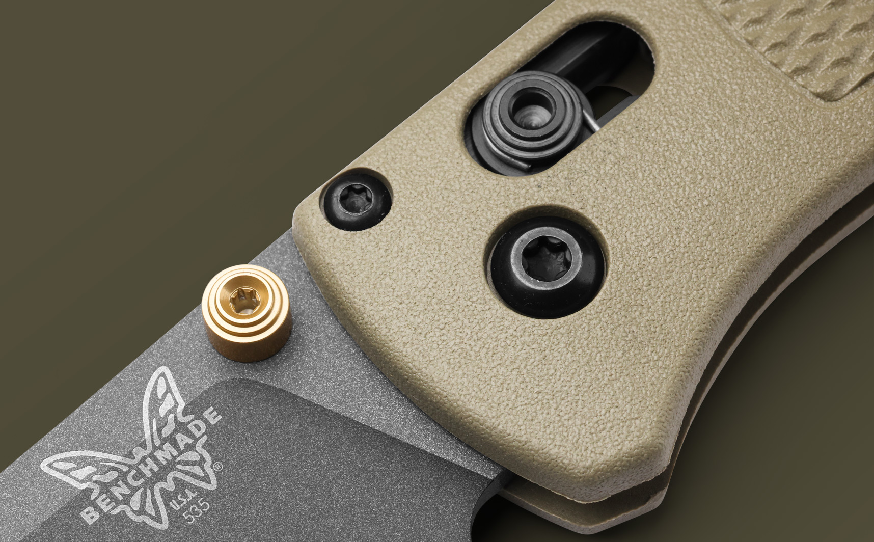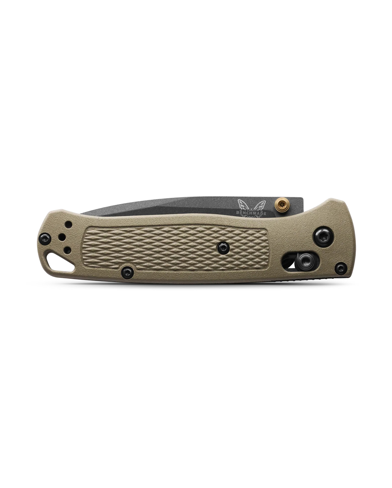 Розкриття ножа проводиться за допомогою двостороннього анодованого в блакитний колір шпенька, а надійну фіксацію забезпечує розроблений і запатентований компанією Benchmade замок AXIS. Зручна рукоять блакитного кольору з полімеру Grivory здатна витримувати високі температури і володіє великою міцністю. Плашки текстуровані для кращого захоплення при роботі. Крім того, ніж буде зручний як правшам, так і лівшам, тому що виробник дає можливість переставляти кліпсу. Як доповнення в підставі рукояті розташоване досить великий отвір для темляка.