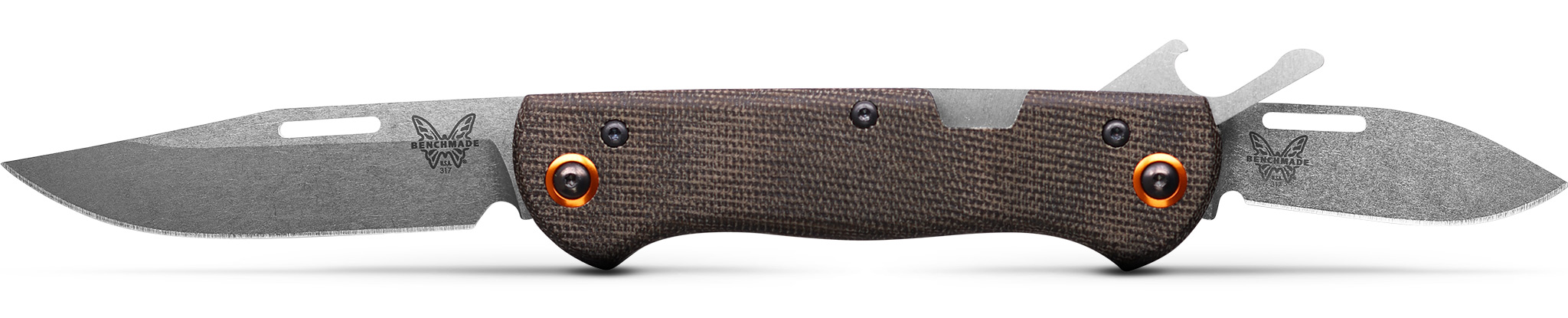Сучасний погляд на класичну модель американського ножа типу каное. 317 Weekender™ - це репродукція традиційного багатолезового кишенькового ножа Benchmade, створена спеціально для ваших улюблених пригод у вихідні. Виготовлений зі сталі CPM-S30V, Weekender™ може похвалитися основним лезом типу clip point, меншим універсальним лезом типу drop point і складною відкривачкою для пляшок – все, що вам потрібно, щоб завершити роботу в поході і насолодитися прохолодою біля багаття. Від обрізки тріски до підготовки денного улову — 317 Weekender™ підходить для міських умов і готовий до роботи в кемпінгу.