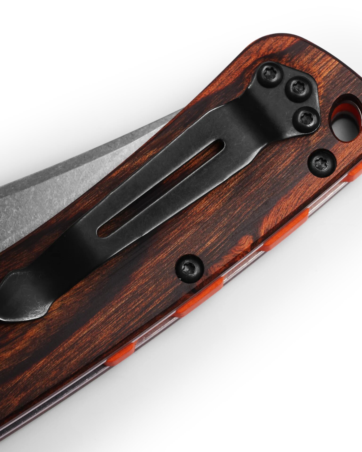 Складаний ніж має ергономічну рукоять, яка виконана у вигляді сталевих лайнерів із закріпленими на них накладками зі стабілізованої деревини. Матеріал несприйнятливий до впливу вологи, перепадів температур, не холодить руку на морозі і має високі естетичні показники. На кінці рукоятки для додаткової страховки від втрати передбачено отвір для закріплення темляка.